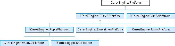Implemented in CeresEngine::ApplePlatform, CeresEngine::EmscriptenPlatform, and CeresEngine::Win32Platform.